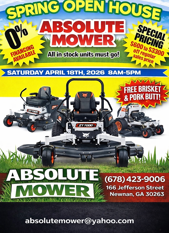 Absolute Mower Sales and Service is your full service lawn mower sales, parts and service center for the Coweta county area. Whether you have residential or commercial equipment, we can help keep your lawn mowing and landscaping equipment running to perfection and provide you with quality lawn care products at competitive prices.